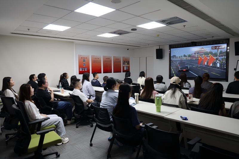 上午9时,会议室里座无虚席,大家怀着崇敬的心情共同见证这一庄严时刻。当看到直升机空中护旗梯队护卫旗帜率先通过天安门广场,悬挂着“正义必胜、和平必胜、人民必胜”的醒目标语时,会场响起阵阵掌声,浓厚爱国情怀洋溢在整个会议室。