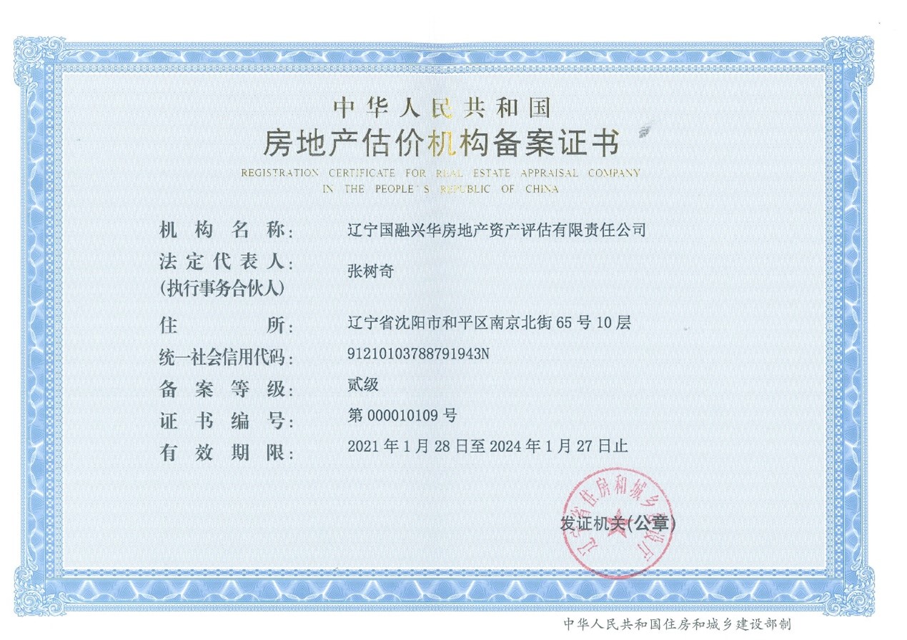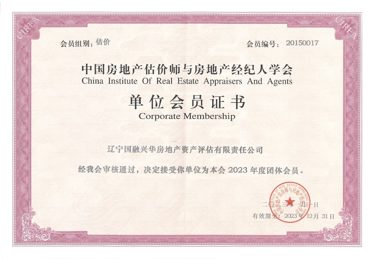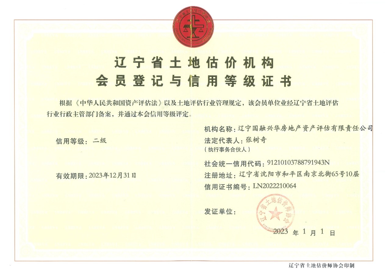 公司是同时拥有住建部一级房地产评估资质、自然资源部全国范围内从事土地评估业务资质、财政部资产评估资质的综合性评估公司。公司是中国房地产估价师与房地产经纪人学会的团体会员单位、辽宁省房地产行业协会副会长单位;中国土地估价师协会团体会员机构、辽宁省土地估价师协会理事单位;中国资产评估协会理事单位,辽宁省资产评估协会副会长单位。